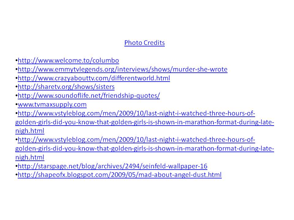 Love a Different World, Friends, and Seinfield-although I don't watch after Kramer's rant either. I also enjoyed the Cosby Show, Martin, Boy Meets World, and Family Guy…the last two I watch with my little sister…good times:)